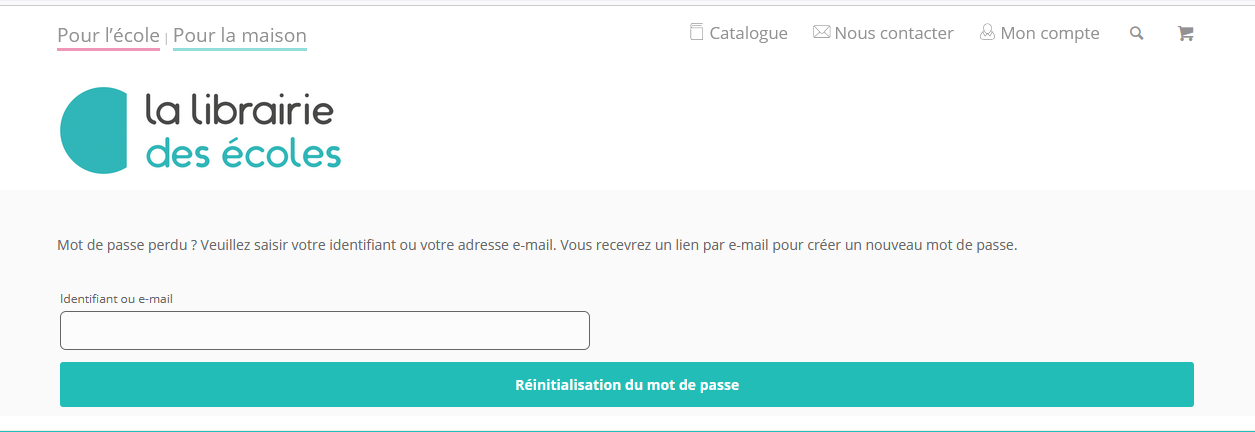 N'hésitez pas à nous contacter à l’adresse contact@lalibrairiedesecoles.com si vous ne le recevez dans l’heure suivant la demande de réinitialisation.